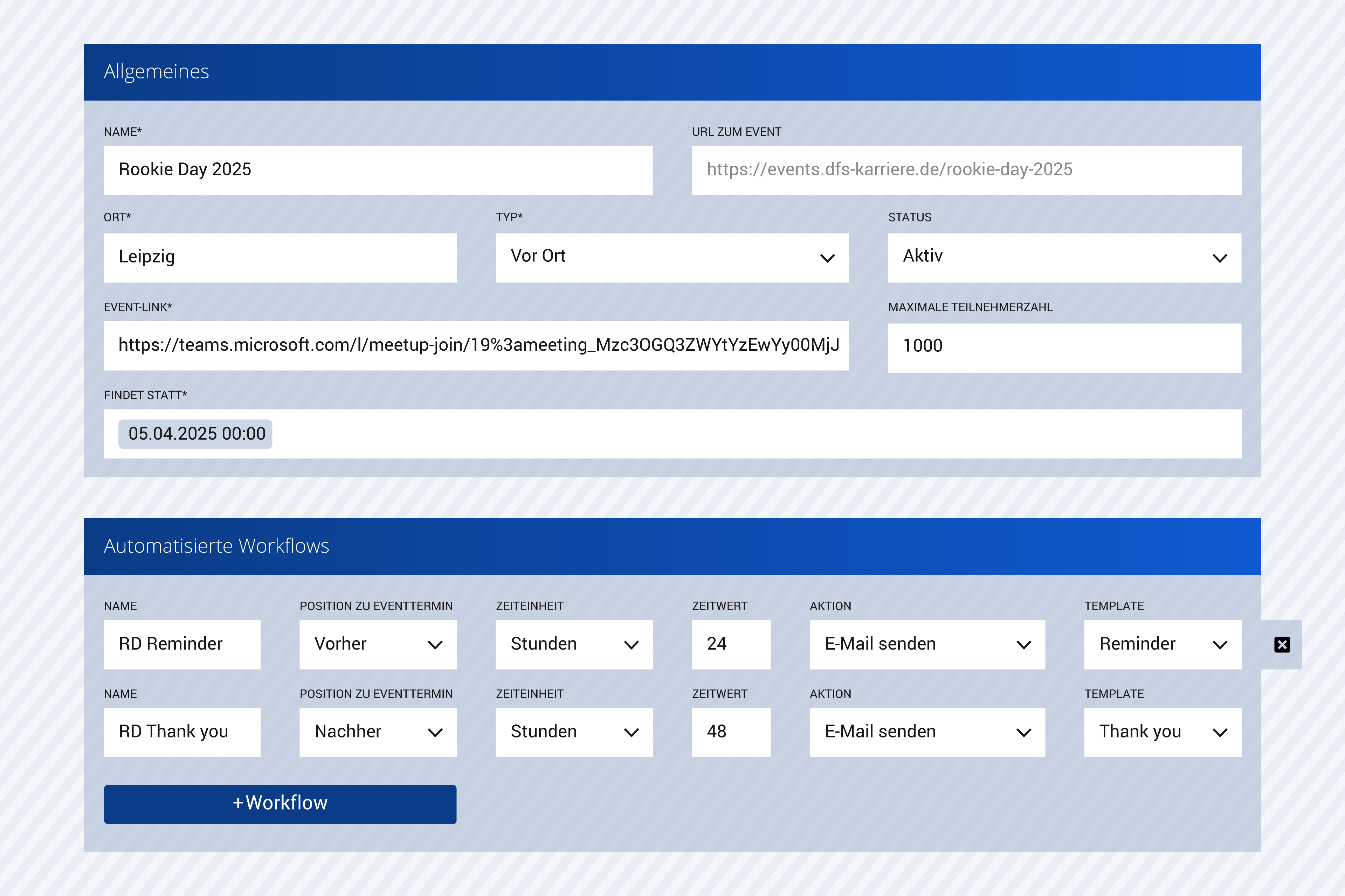 Der Event Manager ist ein Tool zur Verwaltung von Recruiting Events. Dieser ermöglicht die Verwaltung von Events, deren Anmeldemasken und deren Registrierungen. Zudem gibt es einige Automatisierungen wie beispielsweise das Senden von Eintrittskarten und Reminder-Emails an Teilnehmer.