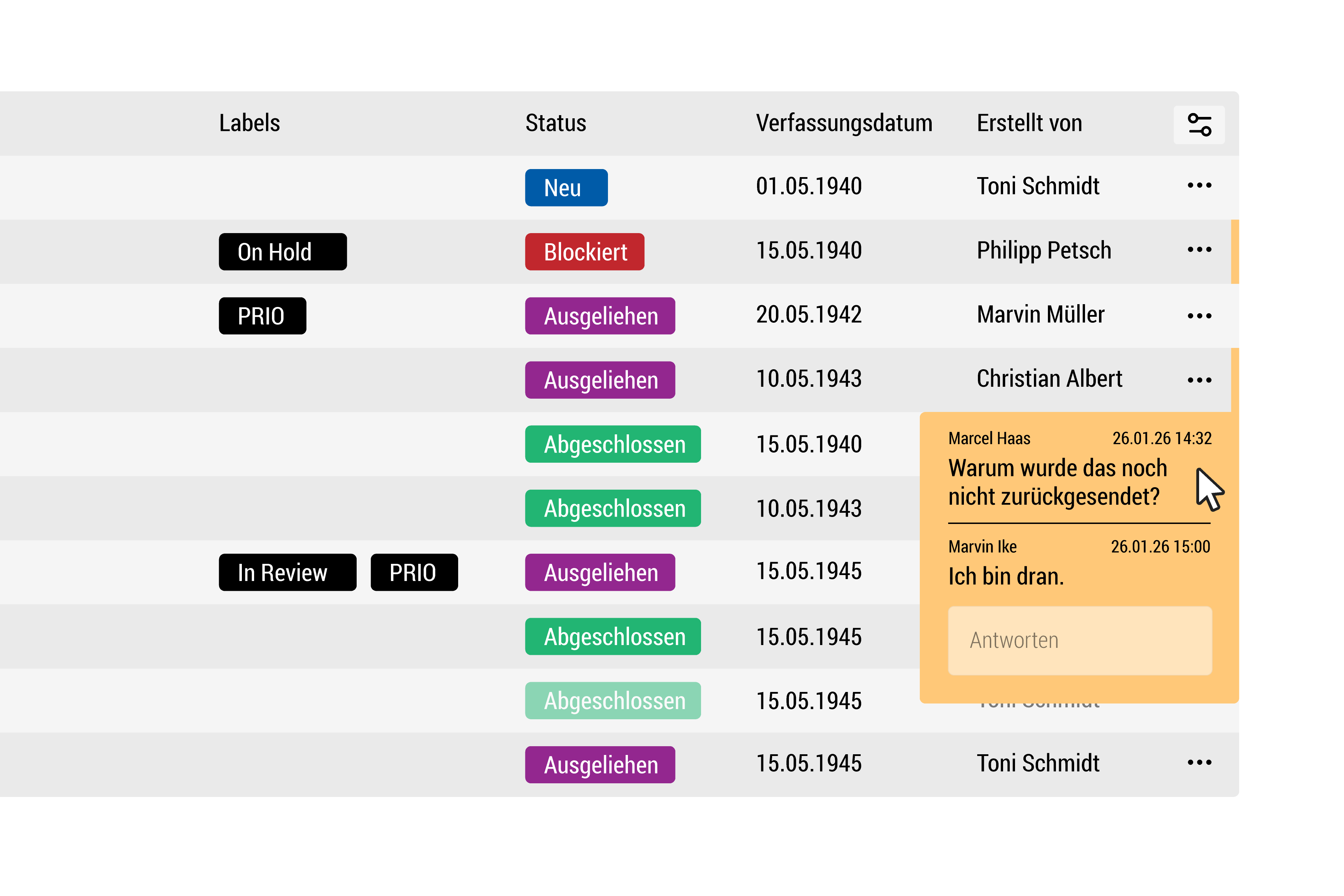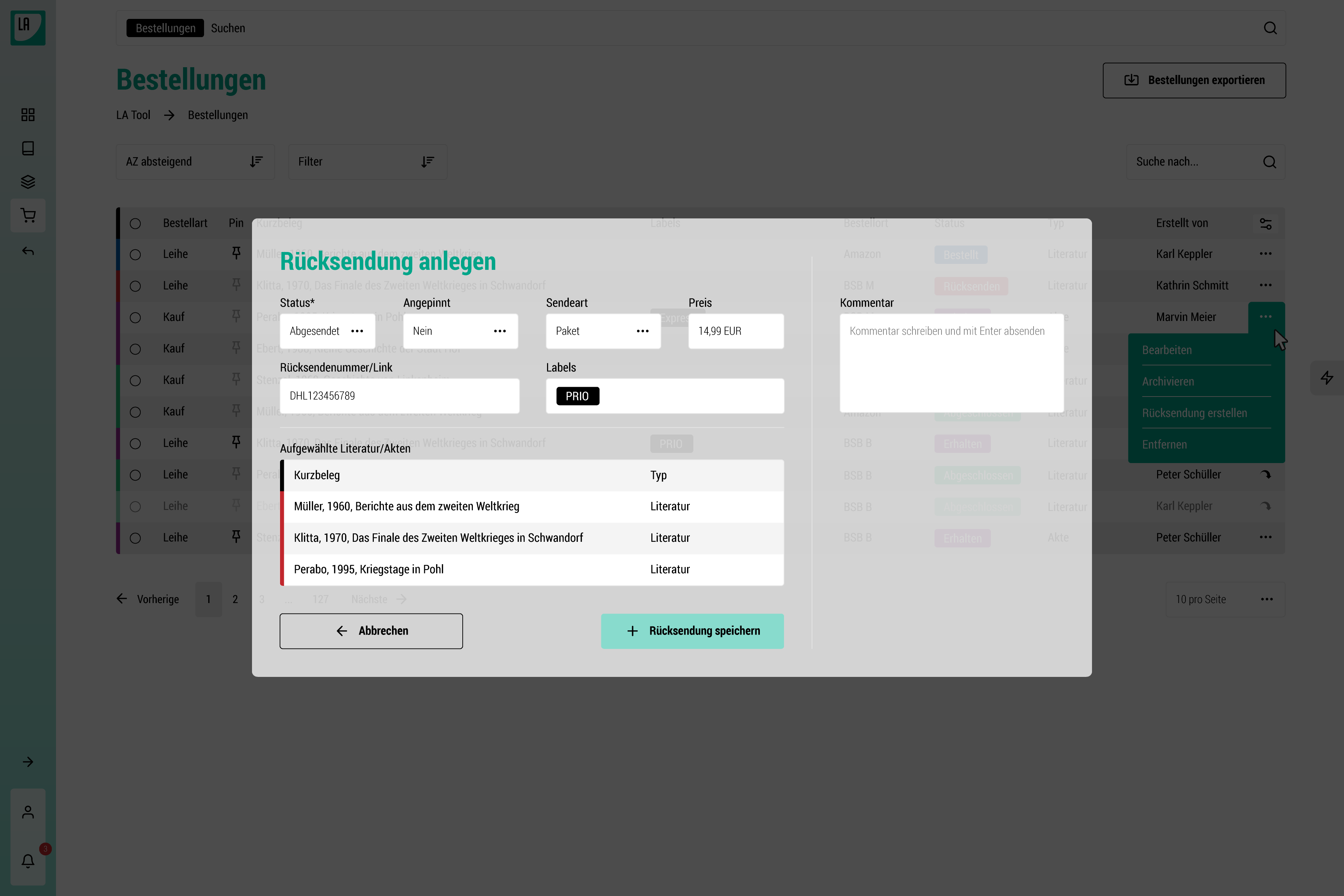 Das LA Tool ist ein Tool zur Verwaltung von Literatur- und Archivgut. Es gibt eine zentrale Liste aller Literatur- und Aktendokumente. Darüberhinaus können aus beiden Listen heraus neue Bestellungen angelegt werden. Handelt es sich bei einer Bestellung um eine Leihe, kann eine Rücksendung angelegt werden. Die Anwendung besitzt einige Rafinessen wie beispielsweise die Möglichkeit in der Listenansicht Kommentare zu hinterlassen.
