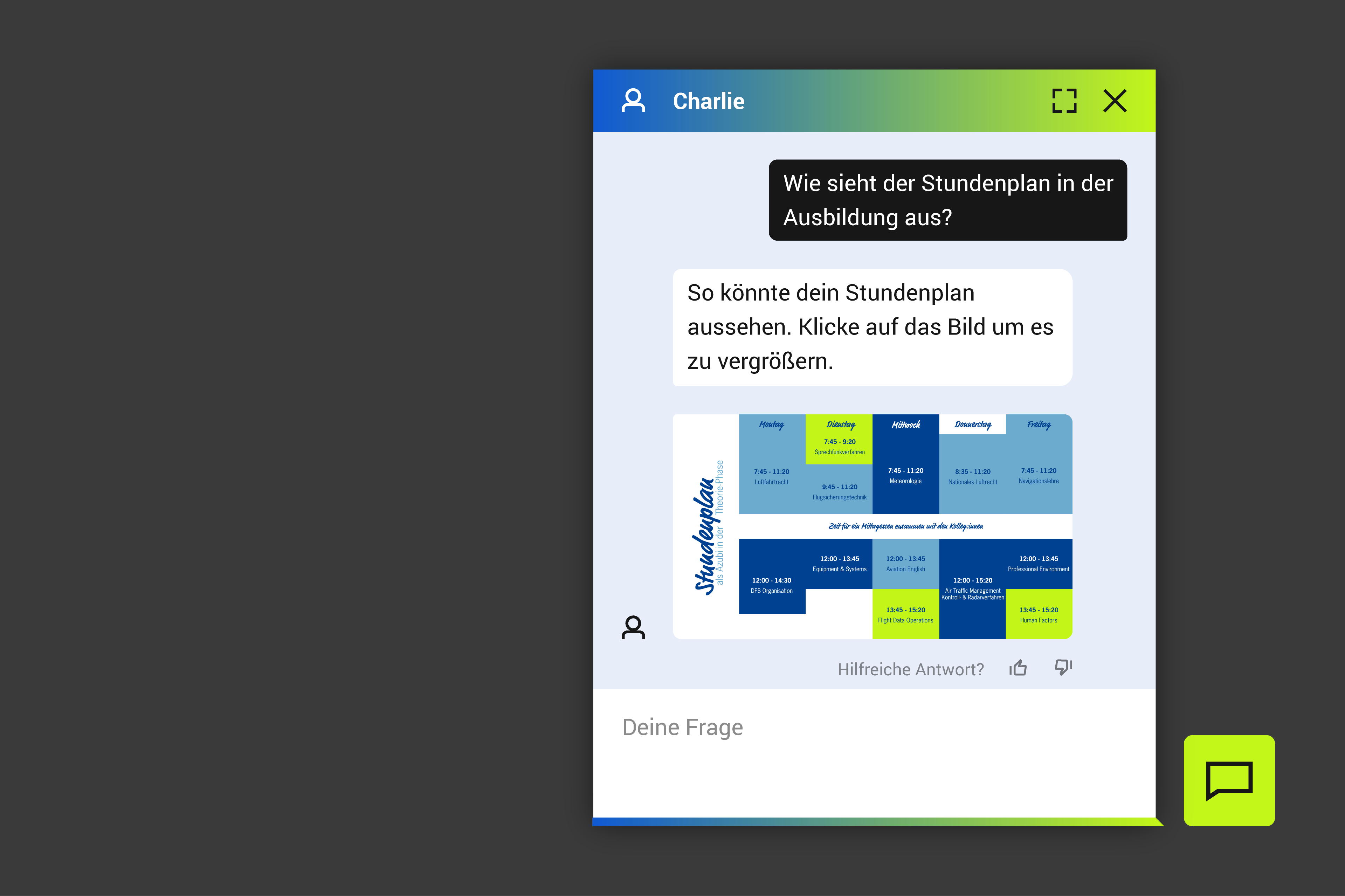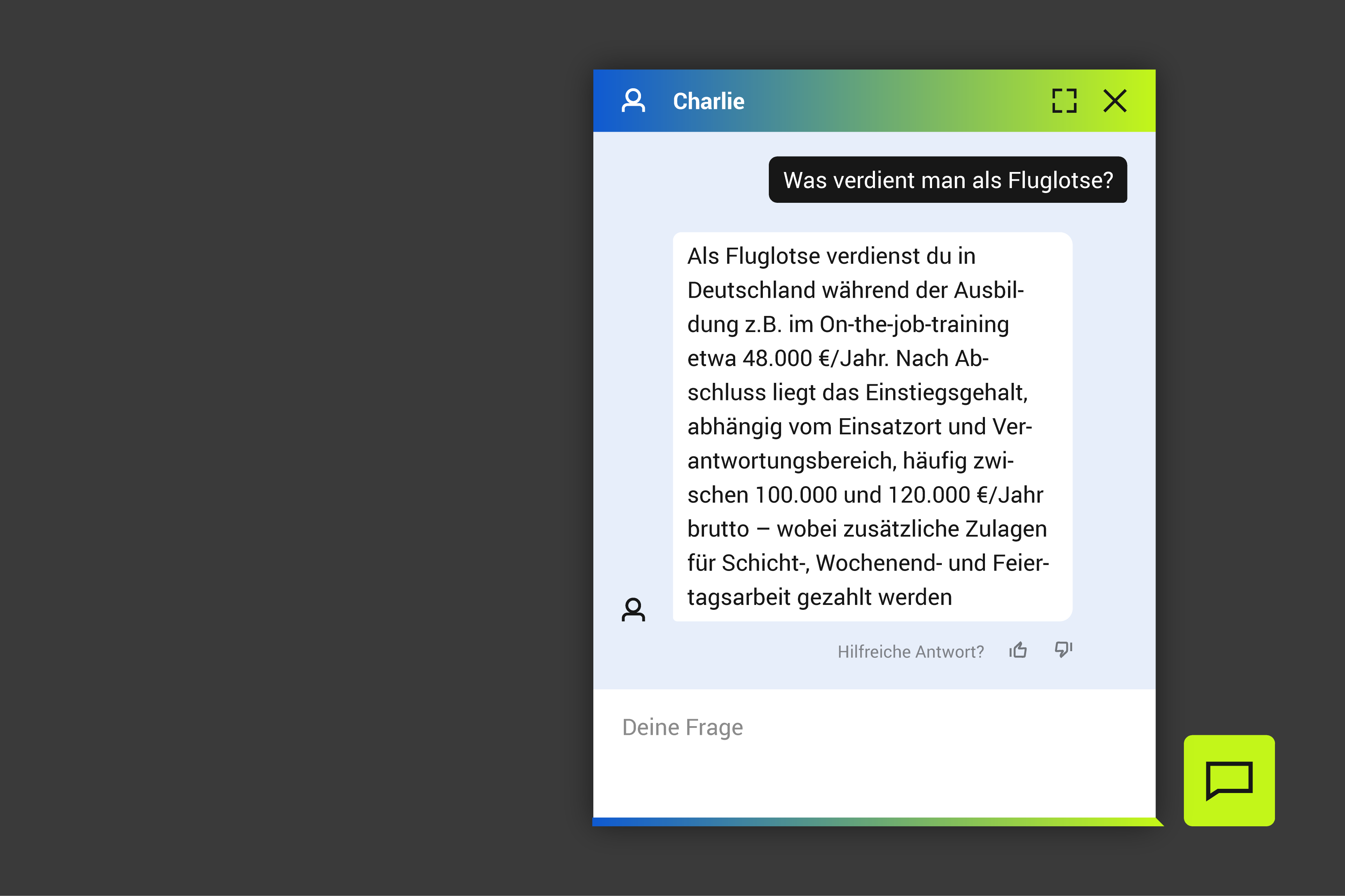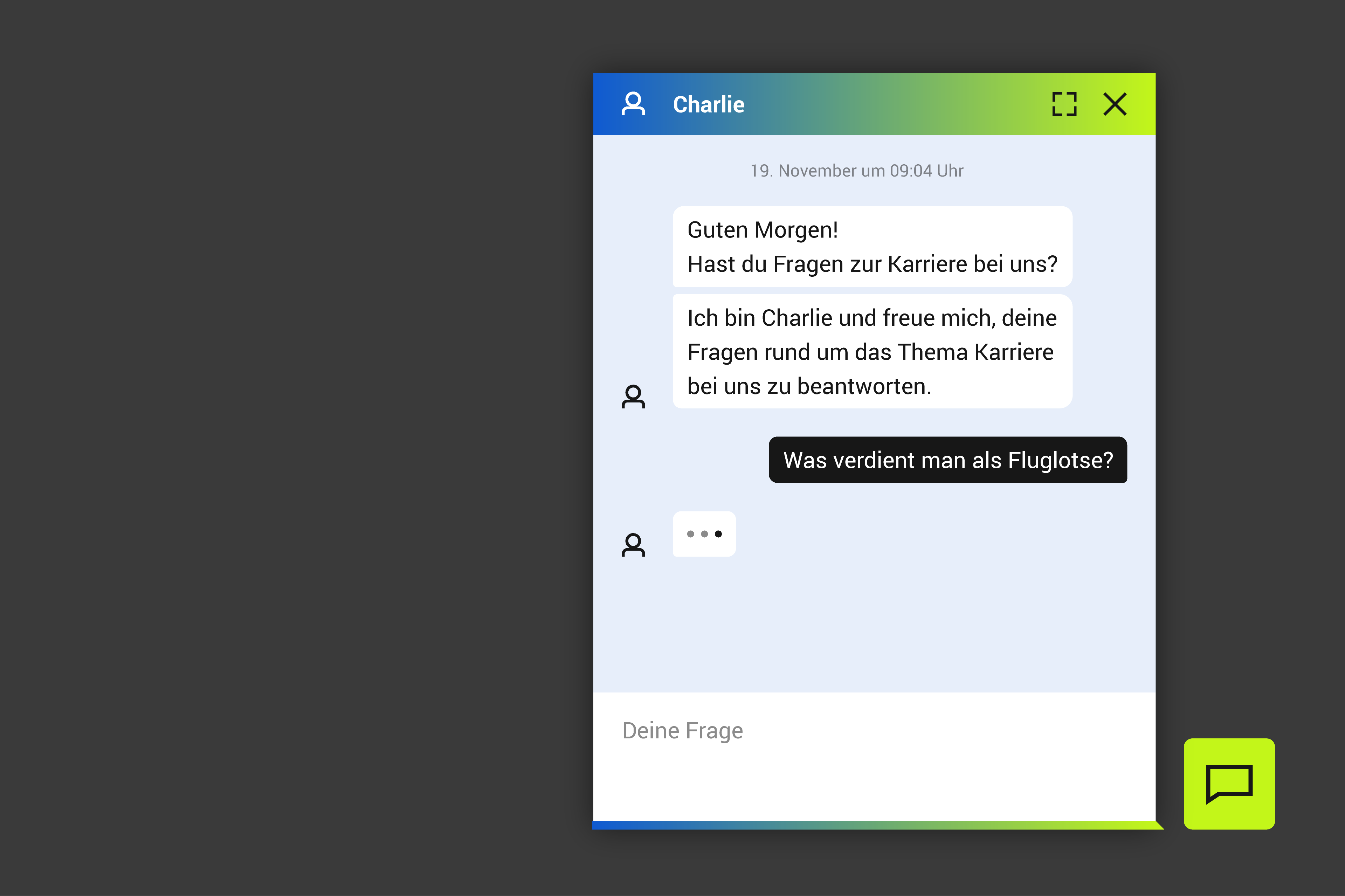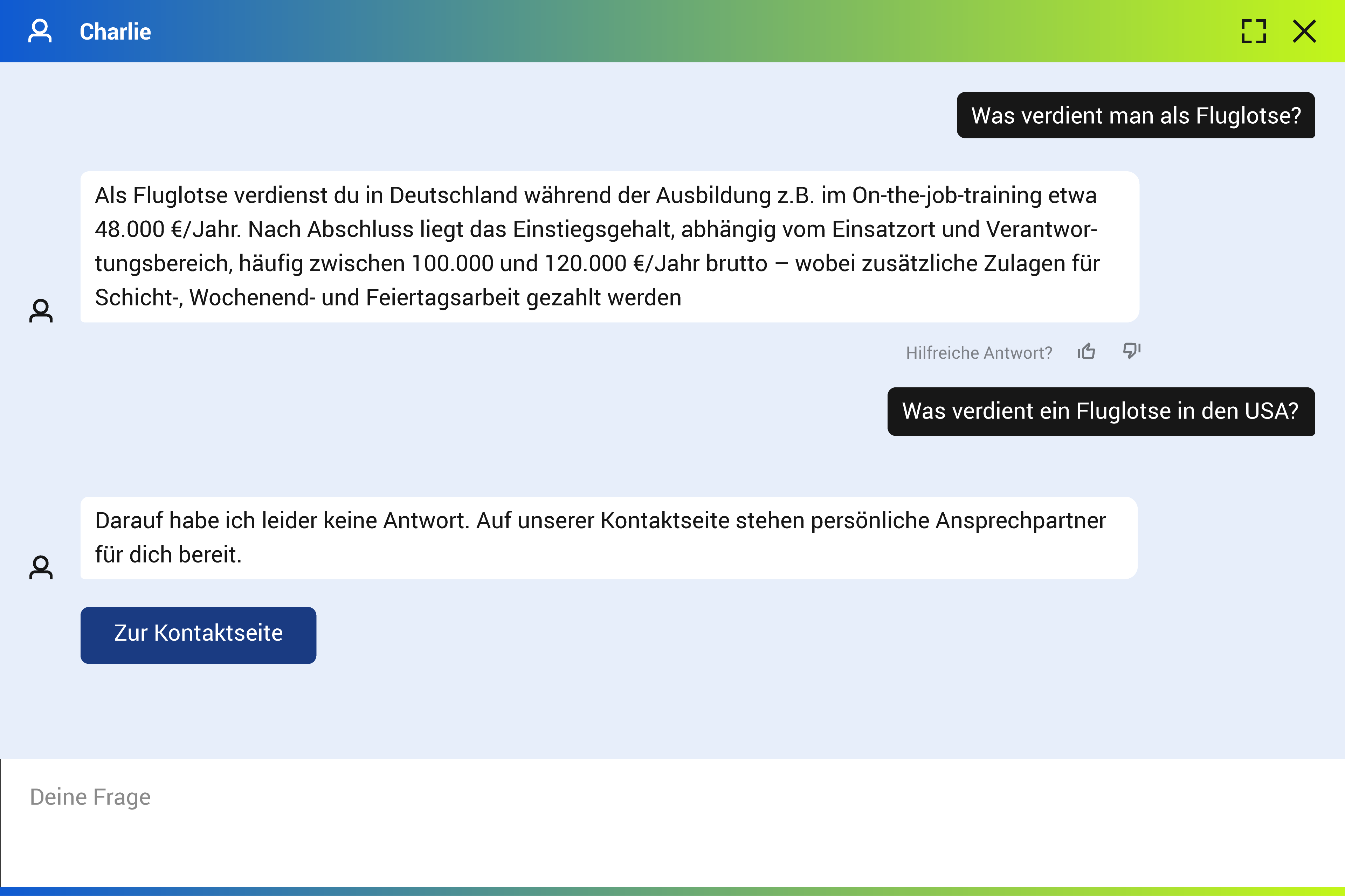 Charlie ist ein Chatbot, der für das Recruiting von Deutsche Flugsicherung eingesetzt wird. Dieser Auftrag umfasste die Entwicklung eines ansprechenden Interfaces sowie die technische Konzeption zur Anbindung an ein RAG-System. Für die Machbarkeitsanalyse wurde zunächst die OpenAI Assistant API verwendet und später auf die Azure OpenAI API umgestellt aufgrund von Datenschutzanforderungen.